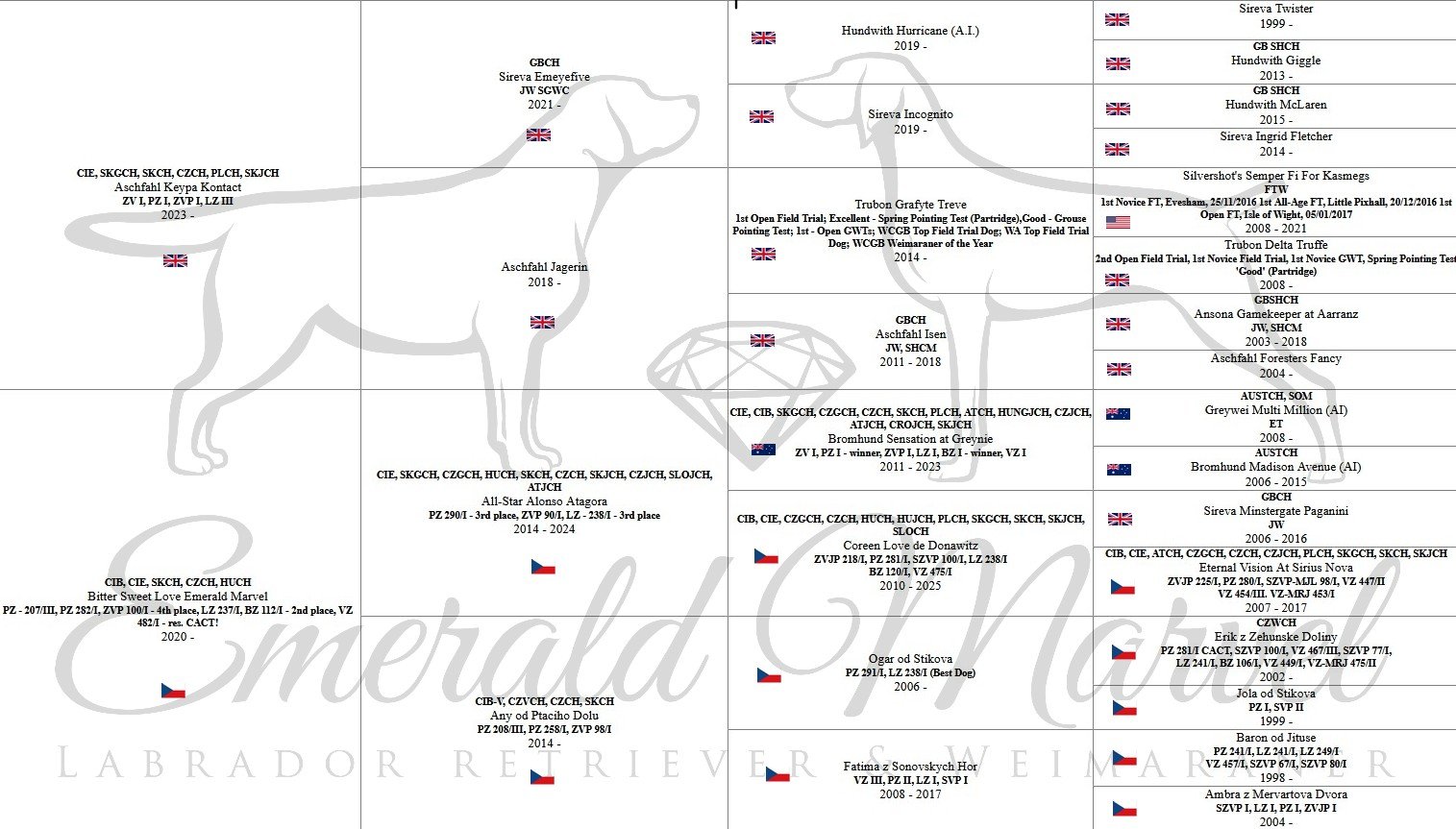 Čtyř generační rodokmen štěňátek vrhu "H" je velice různorodý, nalezneme zde celkem 30 předků, kteří pocházejí z Česka, Velké Británie, USA a Austrálie. V rodokmenu nalezneme 15 šampionů krásy, z toho je navíc 7 předků i Mezinárodním šampionem krásy (nejvyšší výstavní šampionát). Rodokmen je početně zastoupen i psy s loveckými zkouškami, celkem 21 jedinců. Z toho je 7 předků všestranných (nejvyšší lovecké zkoušky - pole, voda, les). Ve čtvrté generaci nalezneme i Šampiona práce CZ.