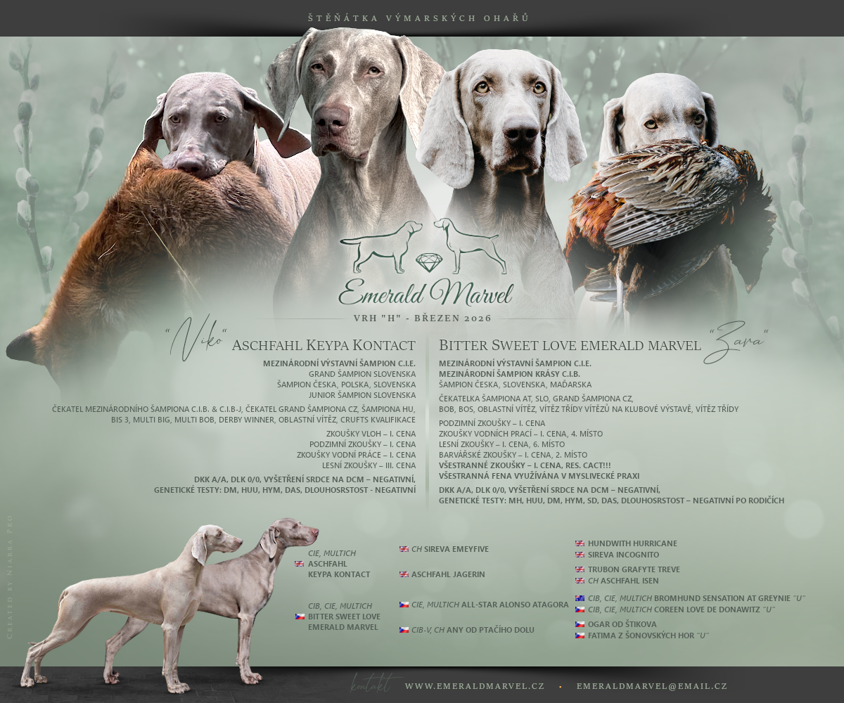 Niko je pes importovaný z Anglie do ČR. Je čerstvě uchovněný a tento vrh bude jeho první v ČR. Anglická linie a hlavně linie Sirevy je pro mě srdcovka, protože z této linie pocházel můj první výmar Tyler, který byl pro mě můj "životní" pes. Vyznačoval se pěkným exteriérem, stříbrnou barvou srsti, krásnou ušlechtilou hlavou, skvělý byl po povahové a pracovní stránce. Proto jsem ráda za tu možnost, že mohu Nika použít do našeho chovatelského programu a věřím tomu, že spojení se Zarou dá velmi nadějné potomky jak po pracovní, povahové a i exteriérové stránce.
